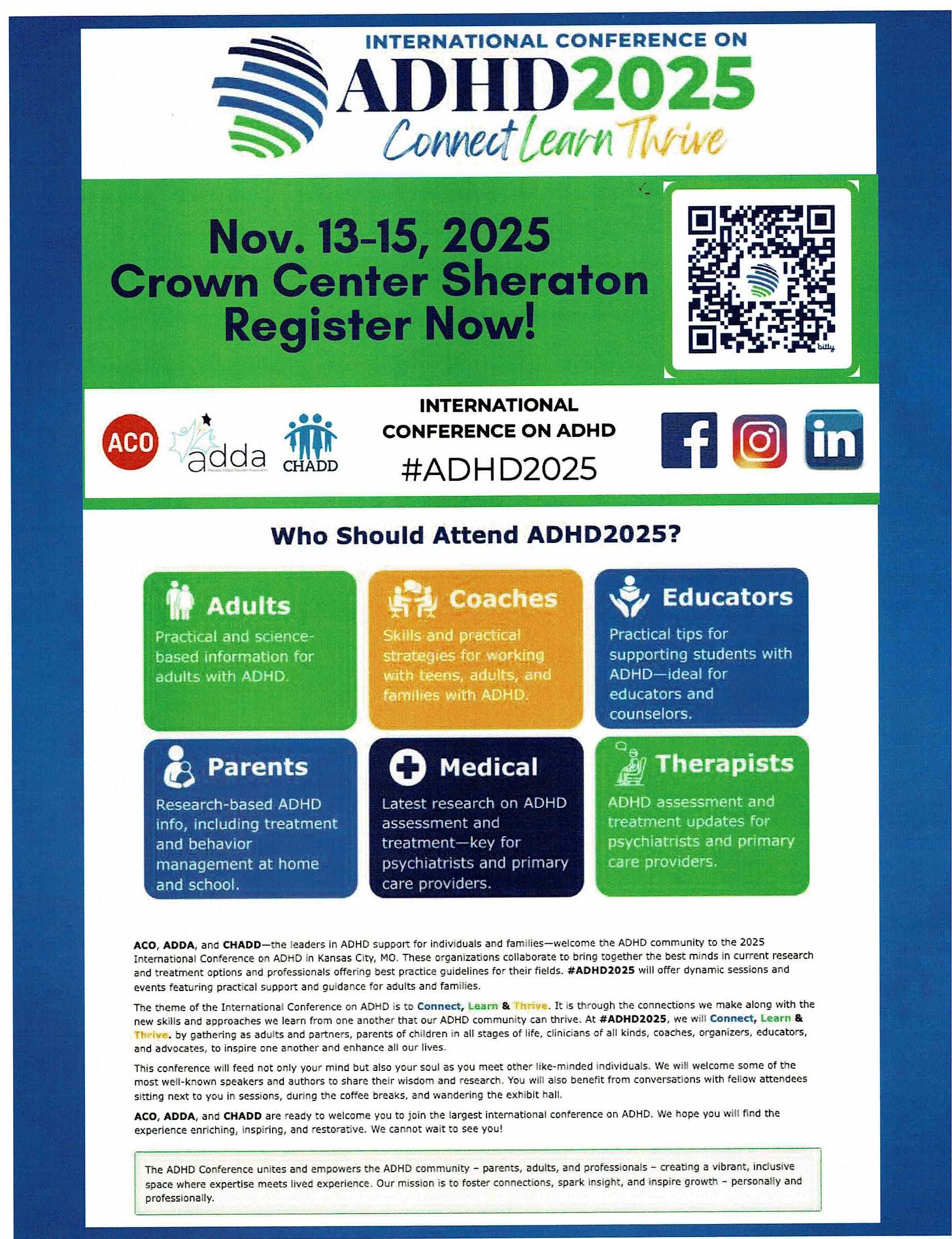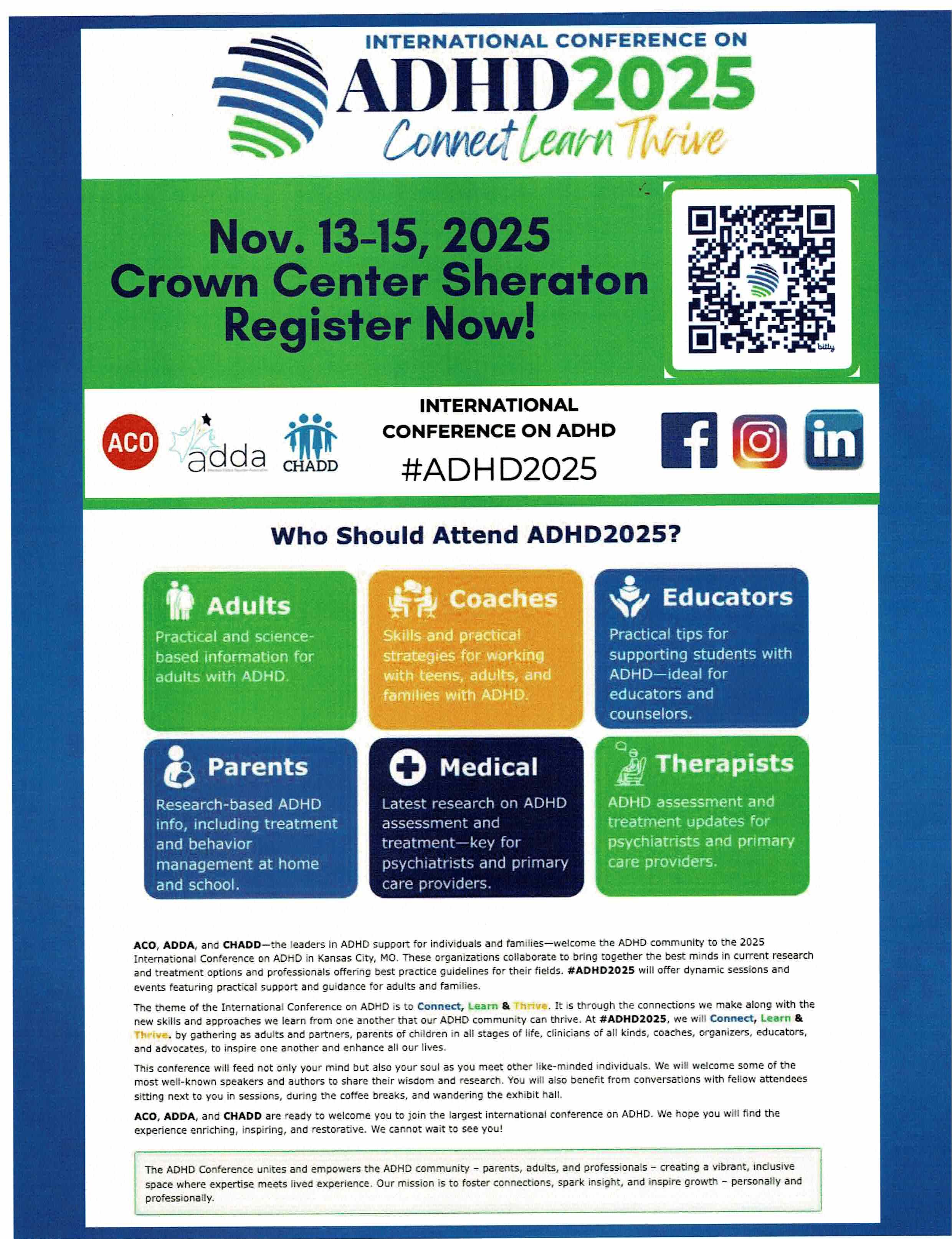 CHADD members will receive a discount, so join CHADD today and designate ADHDKC as your local chapter. Register at CHADD.org/Membership. Be sure to name ADHDKC as your chapter to help support us!