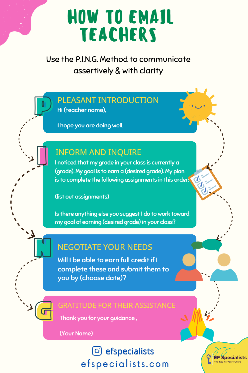 The PING email framework (Pleasant Introduction, Inform/Inquire, Negotiate a Plan, End with Gratitude)